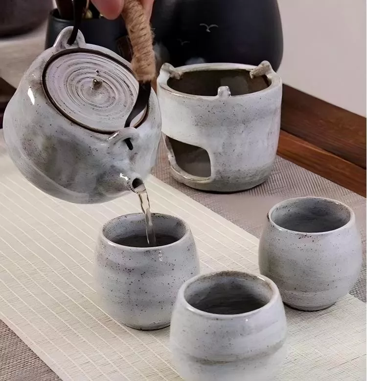 تشتمل مجموعة الشاي التقليدية هذه على إبريق الشاي وثلاثة فنجان شاي ، وتتضمن أيضًا موقفًا من السيراميك للحفاظ على وعاء دافئ.
